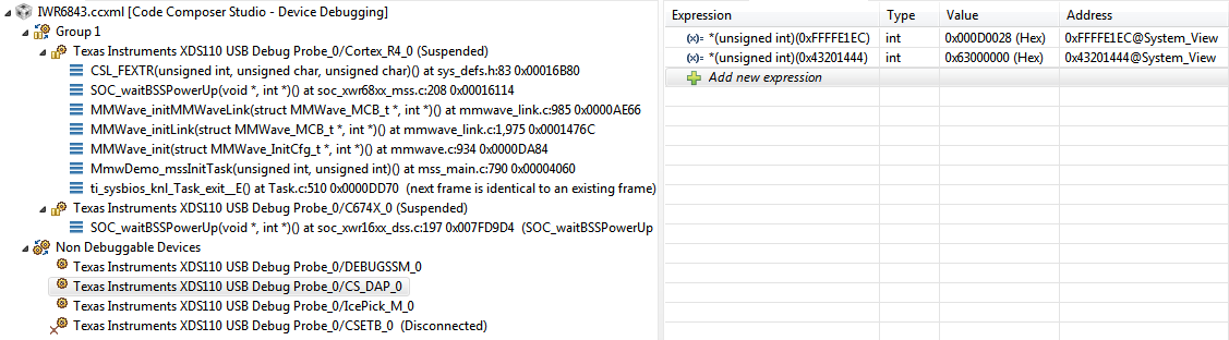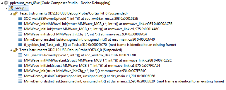 I have now built the firmware from source in CCS, and using the XDS110 debugger I have identified that when this happens, both the DSS and MSS cores are hanging in SOC_waitBSSpowerUp at the following line: