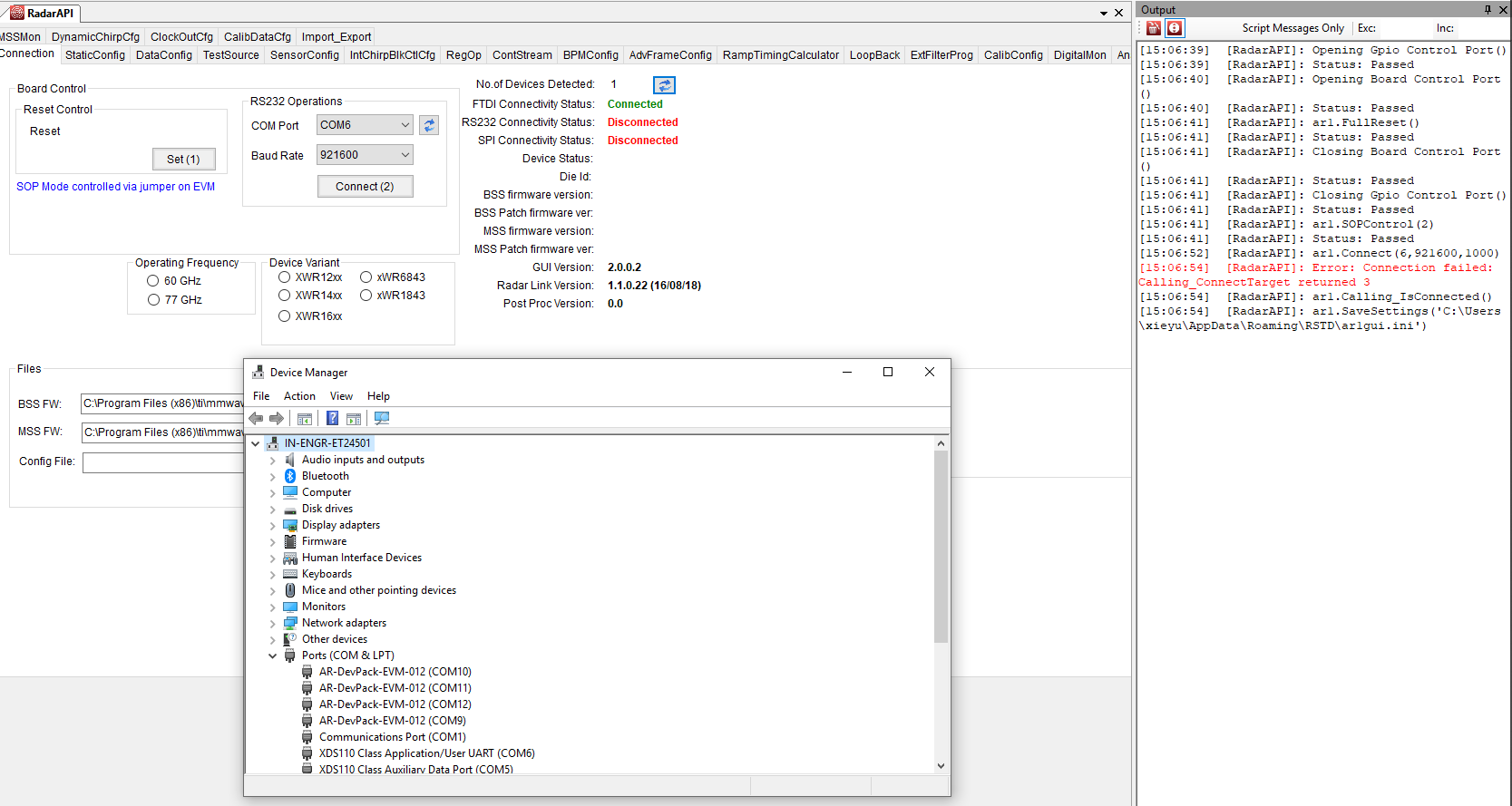 We have AWR1642 Evaluation Module and DCA1000 EVM as shown in the figure below. We are trying to connect these devices to mmWave Studio. However, when we trying to connect RS232 operations after clicking the connect button. It said "[RadarAPI]: Error: Connection failed: Calling_ConnectTarget returned 3" error on Output Window.We had selected the COM Port enumerated as ‘XDS110 Class Application/User UART’ for RS232 operations.