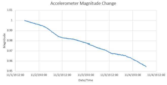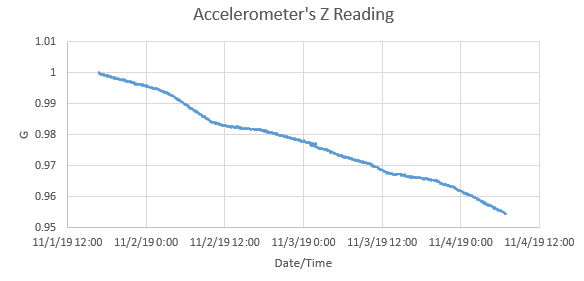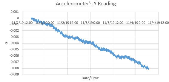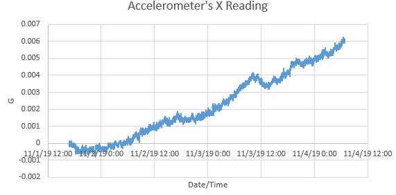 I'm using an accelerometer from a different manufacturer to detect tilt over an extended period of time. I have the accelerometer securely mounted to a stationary object away from any vibration. Over the course of two and a half days, I've found the readings slowly change in value. I've made sure it's not a defective accelerometer by performing this experiment multiple times using different accelerometers but the same exact manufacturer and part number.