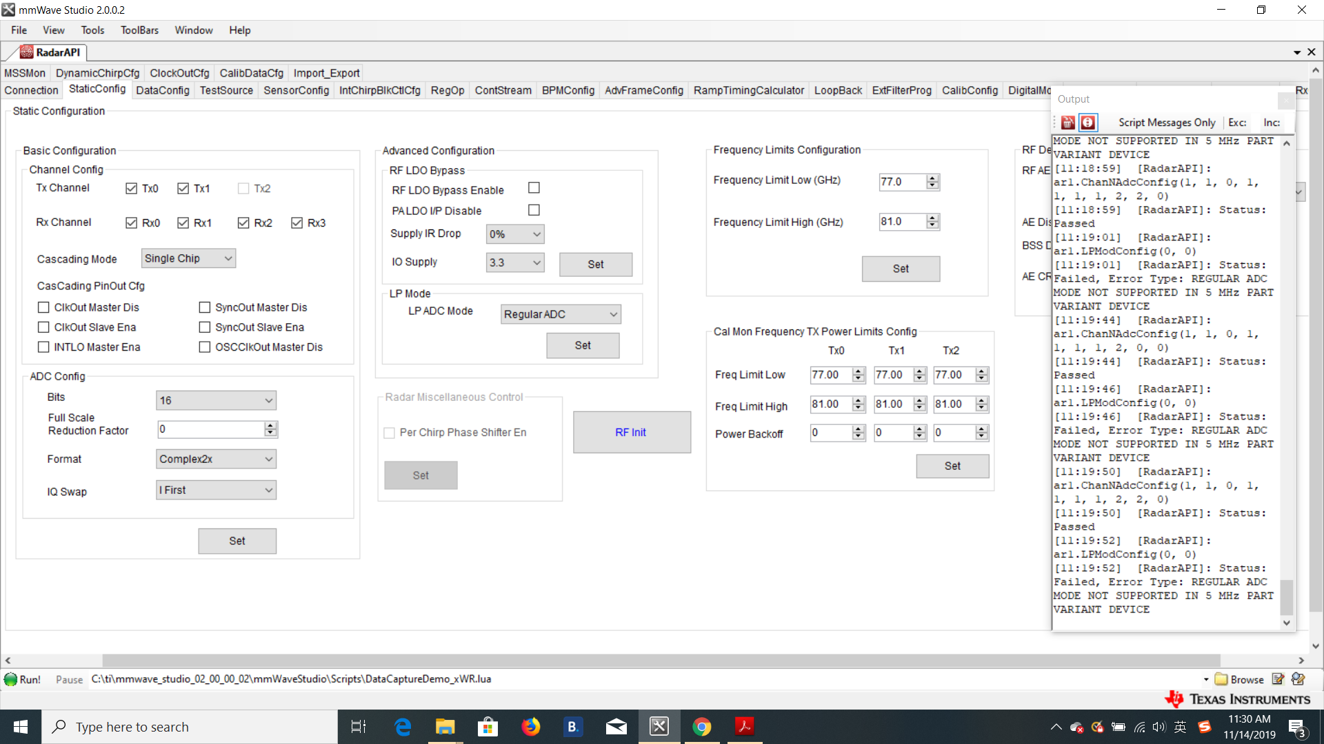 The message is [RadarAPI]: Status: Failed, Error Type: REGULAR ADC MODE NOT SUPPORTED IN 5 MHz PART VARIANT DEVICE