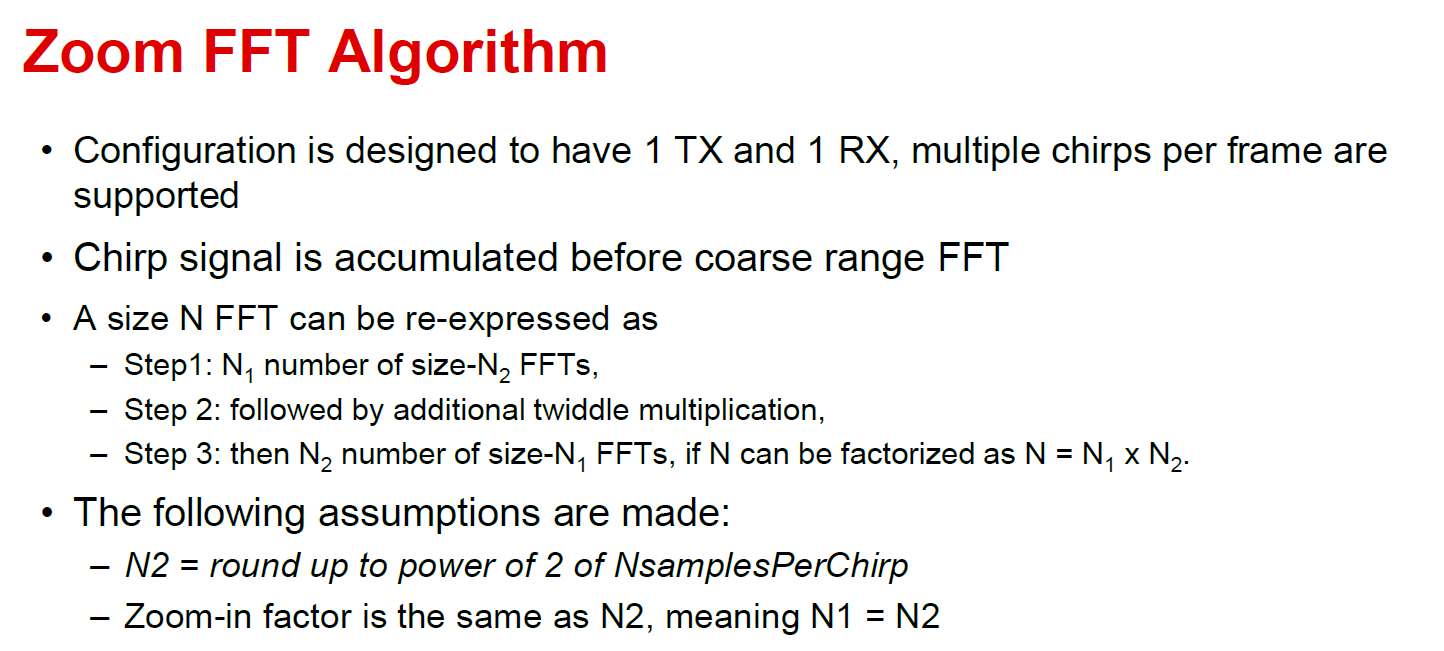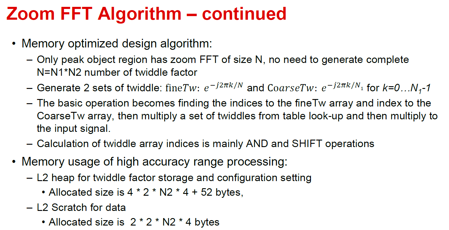 First, the Cooley-Tukey algorithms recursively re-express a DFT of a composite size N = N1*N2. So N-point sampling signal is required for calculation, but according to the TI's ZOOM FFT code, only the N1 sampling signal is used in the calculation(N1=N2).Second, according to the code, the two sets of twiddle(Fine TW and Coarse TW) are extracted after taking the remainder. This is different from the formula in the paper.