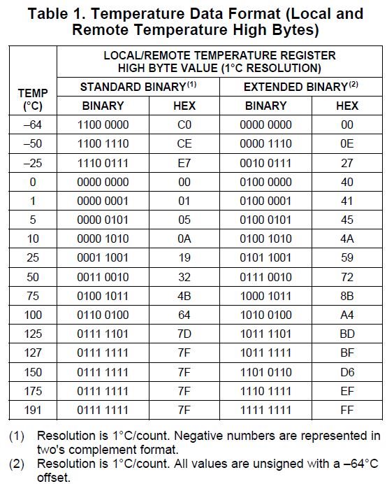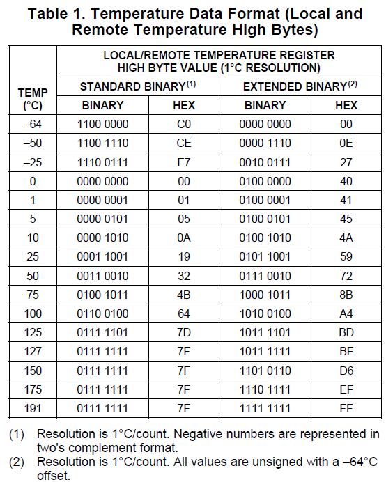 I do not care about the upper end and do not want to take the time in startup to reconfigure the temperature sensor. In standard mode will the device give Two's compliment values below -50C and up two +127C (regardless of the additional error that is not spec'd but is expected at these temperature ranges)?