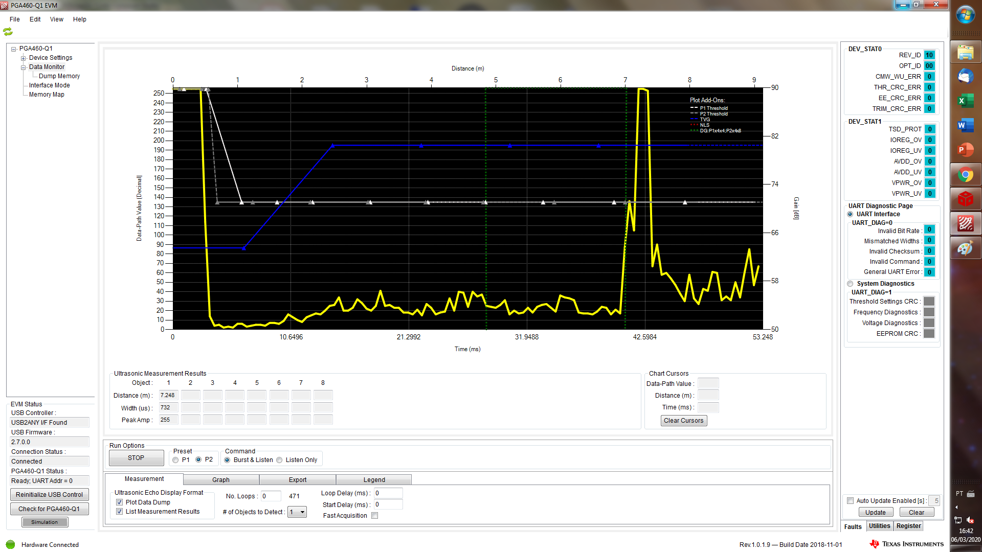 Actually I'm work with a PGA460 applied in a industrial ultrasonic sensor and I don't know why I can not measure more them 5.61 (half of maximum PGA distance in a normal application). When I use a UMR Command and MSB value are locked at 0x41 and LSB changes correctaly.