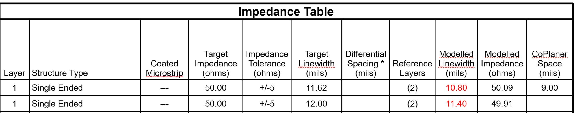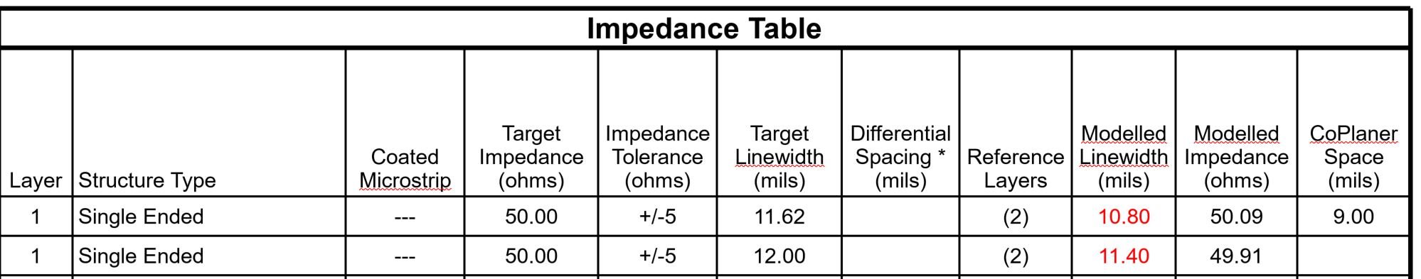 The new trace widths proposed by the board house to meet 50 Ohms are: