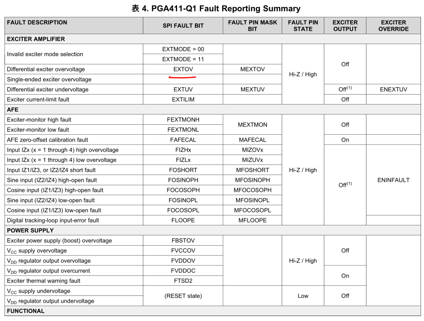 OVEXC(Differential overvoltage threshold) is 14V on page 10 of the datasheet,But VEXCO(Exciter-amplifier differential output voltage) is up to 24.27V on page 8 of the datasheet. Could you explain the difference between OVEXC and VEXCO? When VEXCO greater than 14V, PGA411 will signal the FAULT state(EXTOV)? In other words, What is the protection threshold of EXTOV on page 44 of the datasheet?