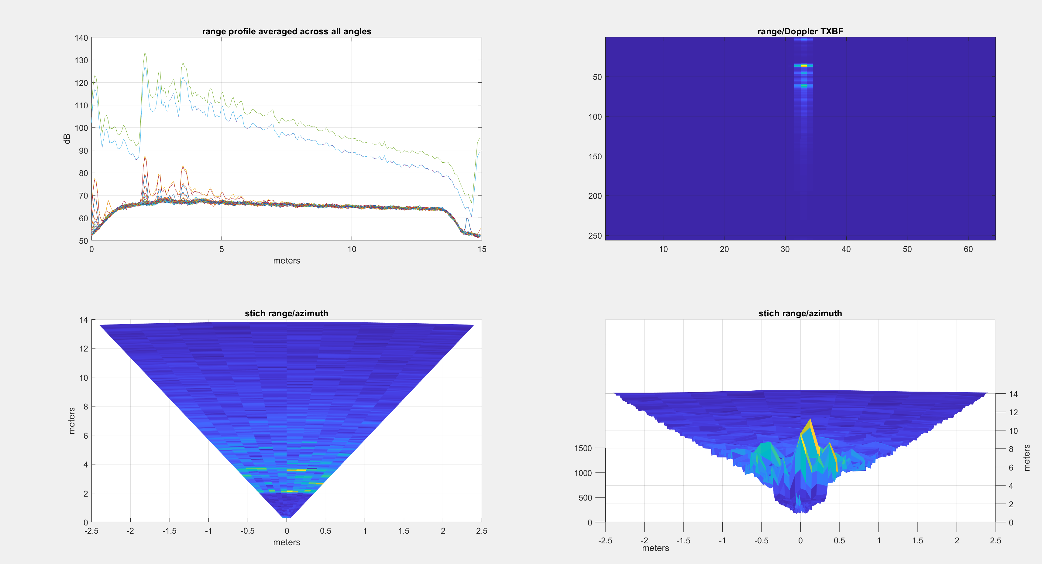 The plots are not using the calibration matrix currently and we are only using the master file (only the first awr1243 chip). We are not using the Hann filters either. I included the range Fft and Doppler Fft profile. The green line in plot 2 are the 2 stationary objects. I included 2 versions of the 2D heatmap since the "view" Matlab function doesn't exist in Python. Also the ^0.2 scaling factor was changed to ^0.4 in Python to make the objects stand out a bit more. Otherwise, everything is pulled together similiar to a logarithm.