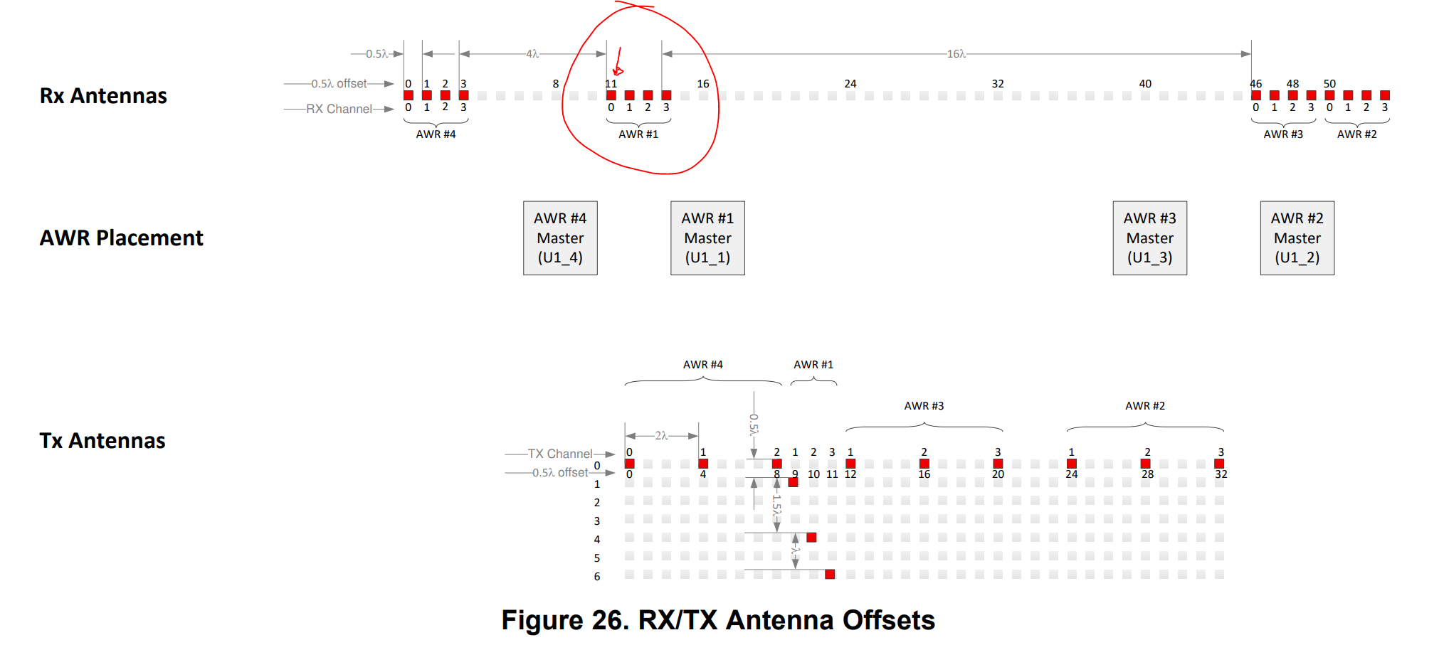 1) Awr #4 is the chip producing the master data file? Per page 37 of the MMWCAS-RF-EVM User's Guide the half wavelength shifts are 0,1,2,3 for Awr chip #4. These are the same shifts seen in D_RX in parameter_gen_from_Jason.m. This is kind of confusing since I thought Awr #1 was normally considered the master.