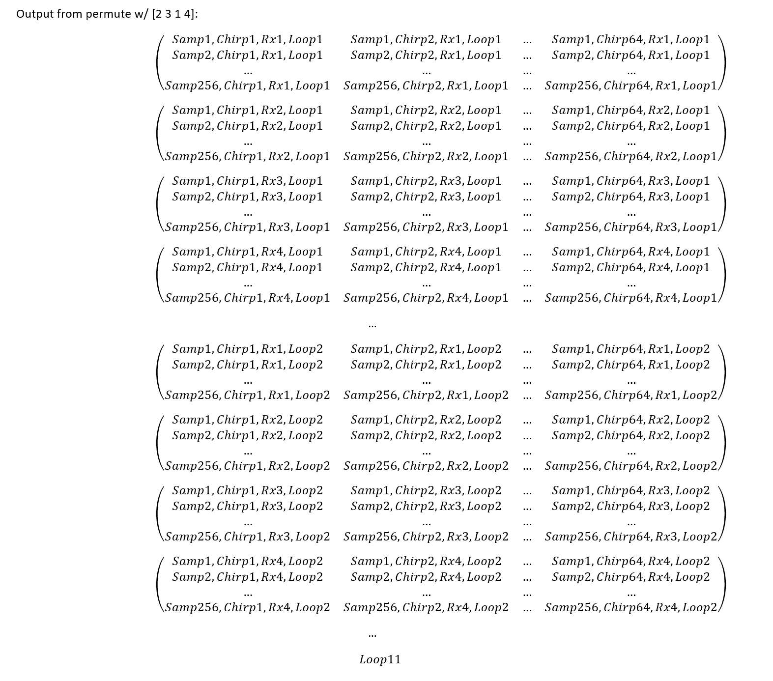adcData1Complex(:,:,1:4,:) = permute(radar_data_Rxchain_master, [2 4 1 3]); adcData1Complex(:,:,5:8,:) = permute(radar_data_Rxchain_slave1, [2 4 1 3]); adcData1Complex(:,:,9:12,:) = permute(radar_data_Rxchain_slave2, [2 4 1 3]); adcData1Complex(:,:,13:16,:) = permute(radar_data_Rxchain_slave3, [2 4 1 3]);