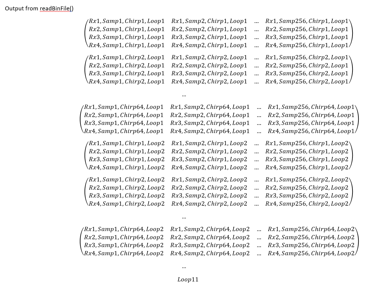 I am using readBinFile() funcation, but I am confused to some parameters, like frameIdx, numLoops and numChirpPerLoop. If my parameter settings are 500 frames, 200 pulses per frame, and 512 sampling points per pulse, how should the parameters I set correspond to the parameters of the readBinFile() function?