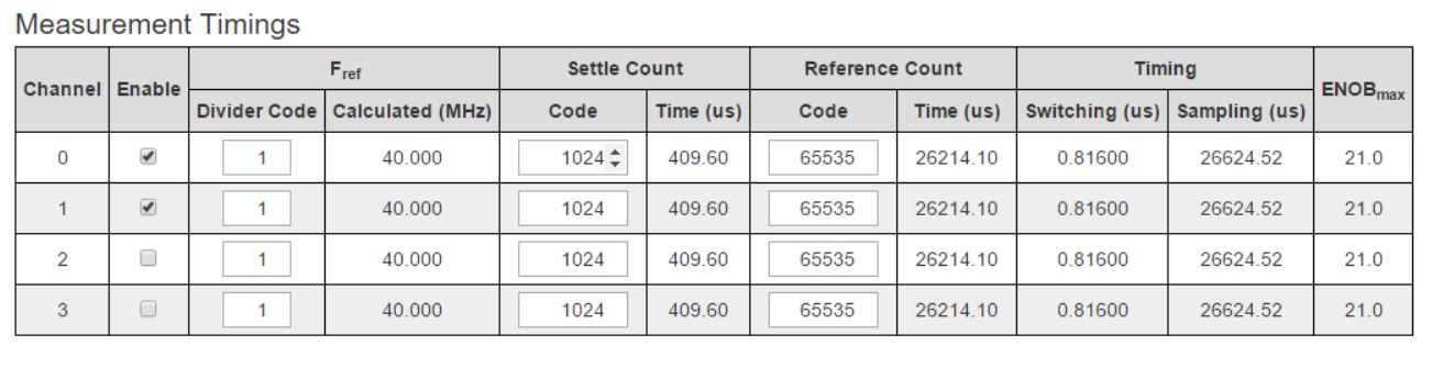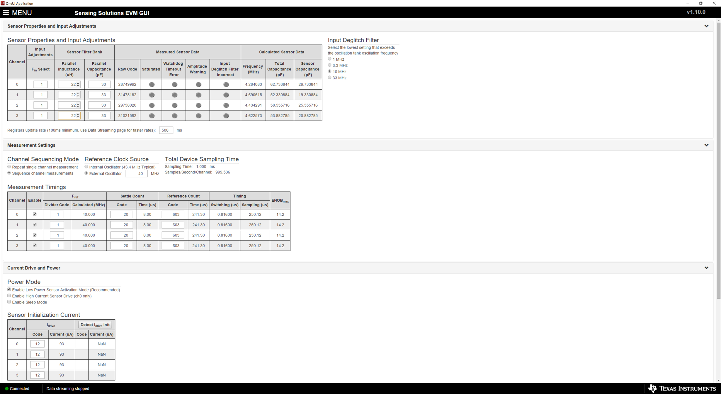 We are currently using FDC2214 as a touch sensor. Our application uses all 4 channels and needs 1000sample / s (Tsample = 1ms) in total, so we set the register values as shown below. (Values such as Idrive have also been adjusted) I have a question here. In this state, I performed "DATA Streaming", touched it several times, and saved it in a csv file. Stop once, When I check the csv file, the value (CH0 MAX) when not touching is 29758020, the value when touched (CH0 MIN) was 29581431. * Both are raw dataSince the ENOB is 14.2 bits, I expected that the value would be 18821 (2 ^ 14.2) or less, but it seems that 28 bits of data are taken, so I do not know what this ENOB represents It was. If there is a register setting that can increase the sensitivity of data, please let me know. There may be places where I lack knowledge, but I would appreciate it if you could respond.