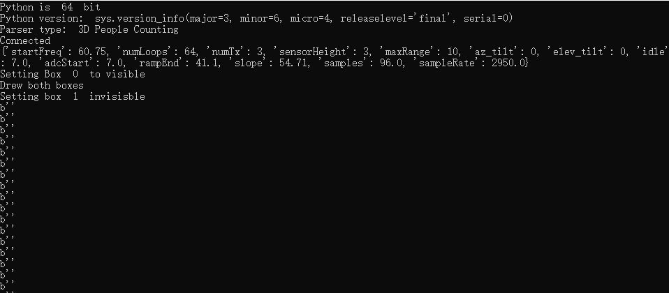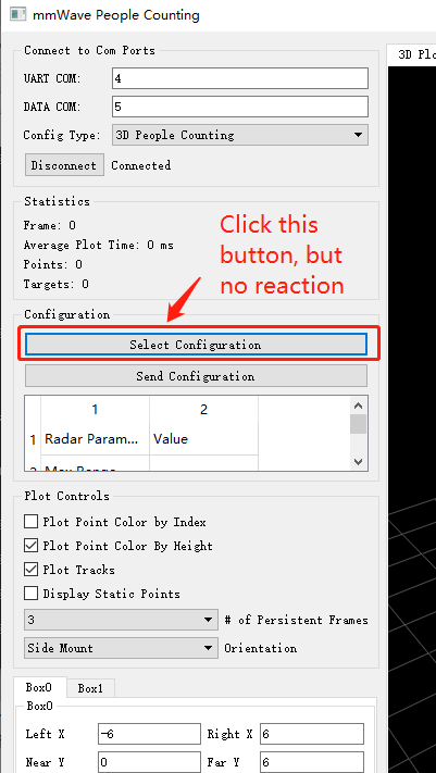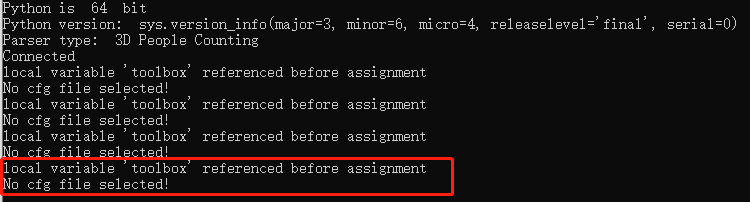 I'm trying to run 3D pplcount demo on IWR6843ISK-ODS. I followed the user guide, but at the 4th step "Run the Lab", there was no reaction when I clicked the "Select configuration" button, which is show in the figure below. I also ran gui_main.py at command line. The 2nd figure shows the hint when I clicking the button. Could you please do me a favor by giving some suggestions about how to address this problem?
