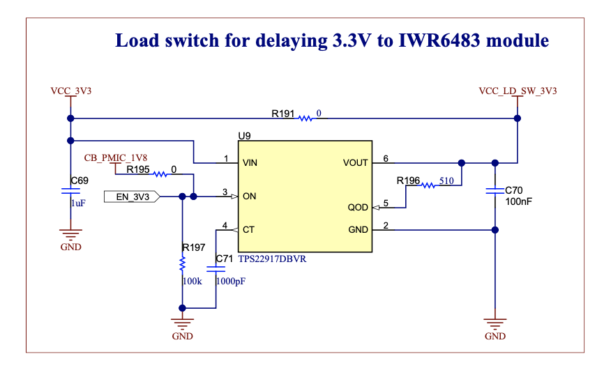 I designed it based on the reference design PROC073C. But I didn't understand the role of U9 (TPS22917DBVR). According to the notes in the schematic, this is Load switch for delaying 3.3V to IWR6483 module. But I didn't understand.