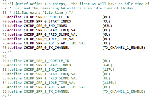Hello, i wanna cancel the velocity disambiguation function in SRR demo because i wil use it in a low speed scene. As we know there are two subframes in SRR demo. One is srr, another is usrr. Now i only use srr frame and want to cancel its velocity disambiguation function realized by chinese remainder theorem. First i cancel srr1 chirp as picture below. Then i change some related variables like "numChirpTypes", ''SUBFRAME_SRR_NUM_CHIRPTYPES" and so on.