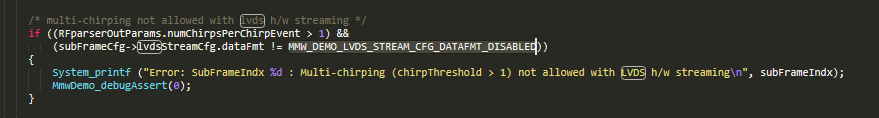 I am looking through the mss_main.c file in the SDK3.4 mmwave demo and I noticed this statement for LVDS streaming. Can someone clarify what multi-chirping means and why LVDS is not allowed when multi-chirping is occurring? Does multi-chirping mean multiple chirp configurations per subframe? If so, what does "different/multiple configurations per subframe" include and exclude? I am assuming it includes the profile config, but does it also include changing each chirp's phase through BPM?