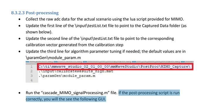 According to section 8.3 in the instruction manual, the customer set the matlab path, ran addpaths, and modified the path of testList.txt. But he encountered a problem when running cascade_MIMO_signalProcessing.m.