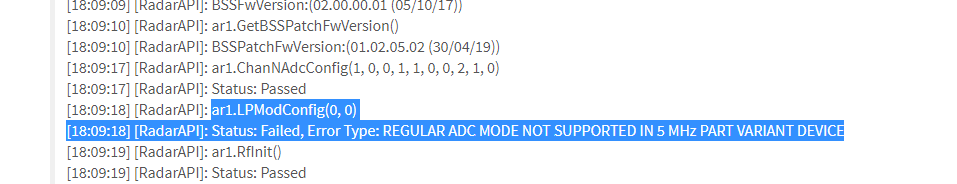 [19:35:26] [RadarAPI]: Status: Failed, Error Type: REGULAR ADC MODE NOT SUPPORTED IN 5 MHz PART VARIANT DEVICE