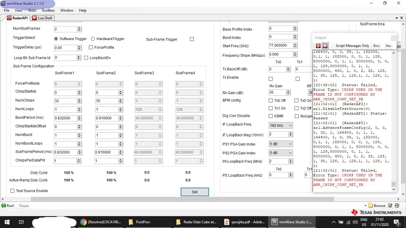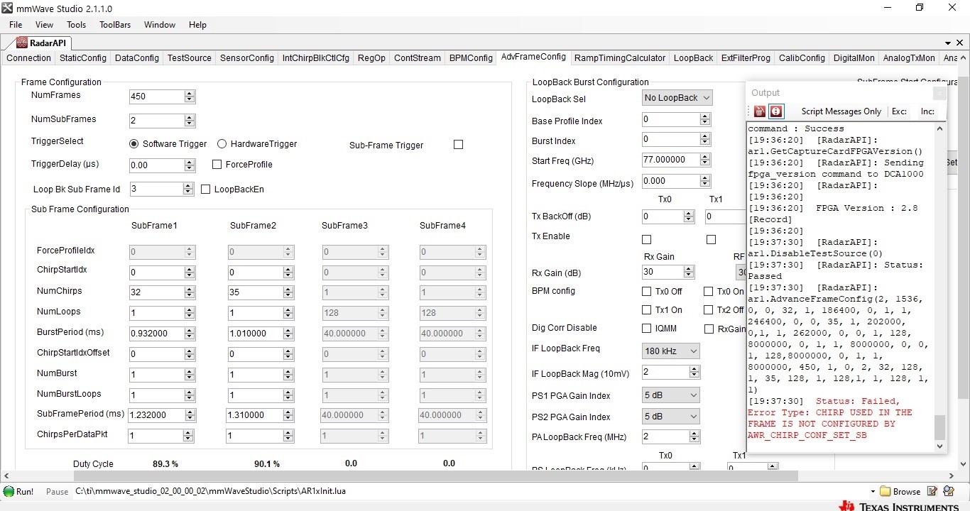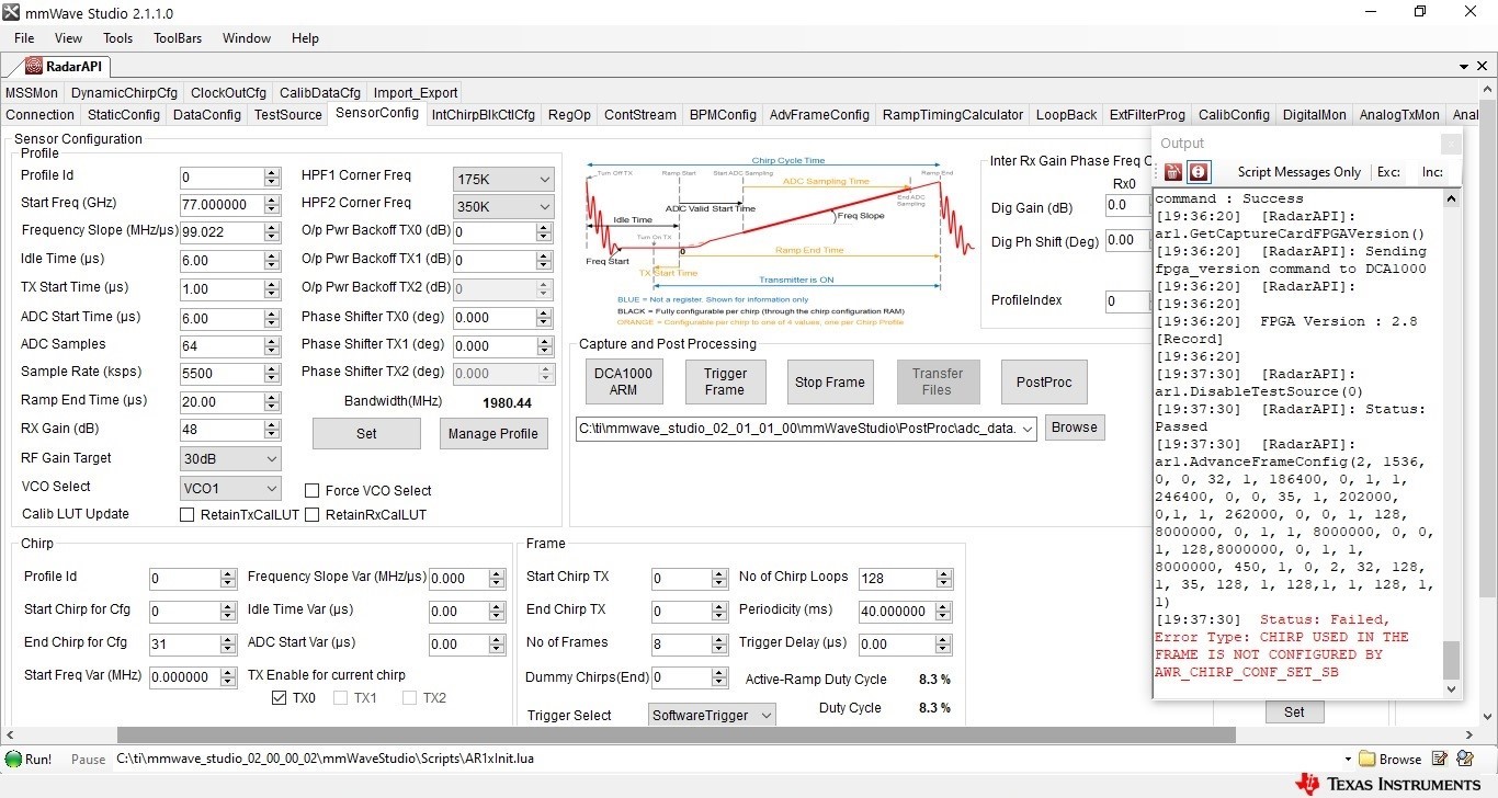 [19:37:30] Status: Failed, Error Type: CHIRP USED IN THE FRAME IS NOT CONFIGURED BY AWR_CHIRP_CONF_SET_SB