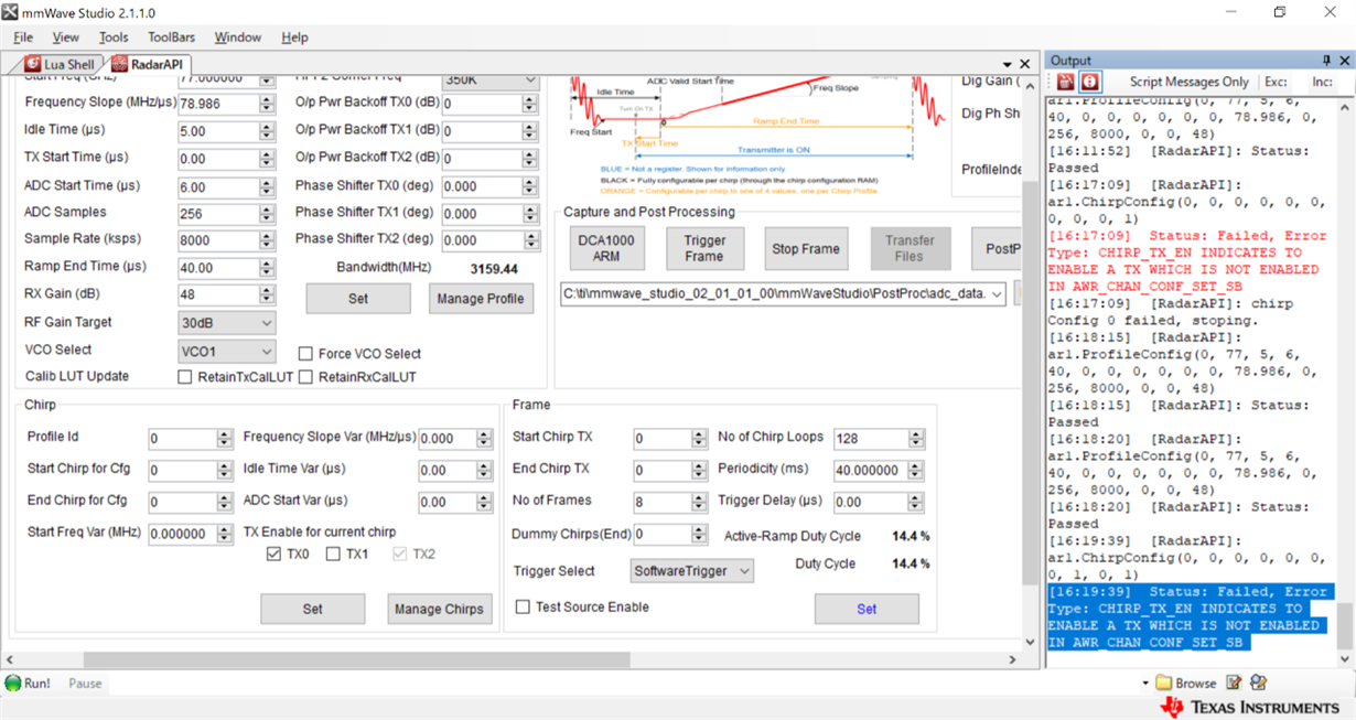 [16:19:39] Status: Failed, Error Type: CHIRP_TX_EN INDICATES TO ENABLE A TX WHICH IS NOT ENABLED IN AWR_CHAN_CONF_SET_SB