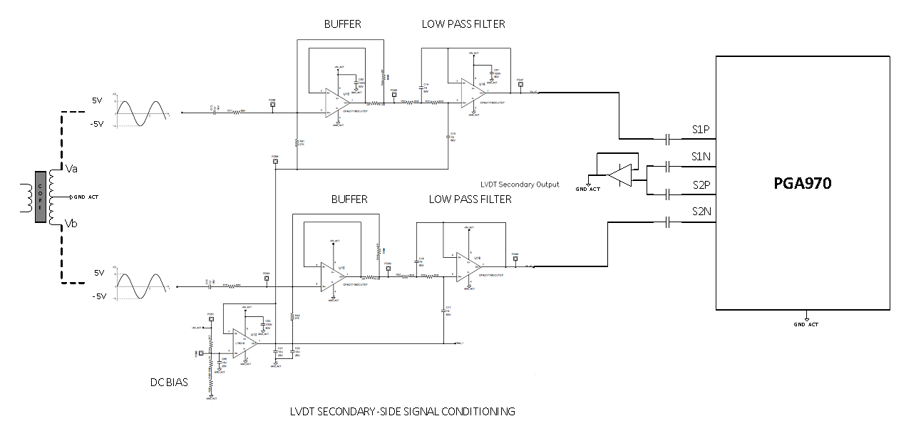 As per the above schematic, the LVDT secondary-side signals are properly filtered and partitioned to achieve the PGA970 ADC Input Dynamic (Vrefmax: 2.5V).