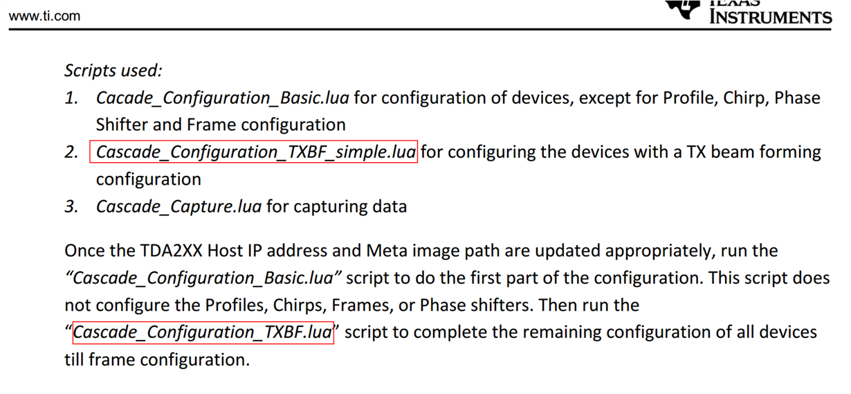 In the MMWAVE STUDIO Cascade User Guide, section 7.2, there are three steps to set up the beamforming mode, but there seems to have a conflict. Which one is correct? What is the difference between these two LUA scripts?