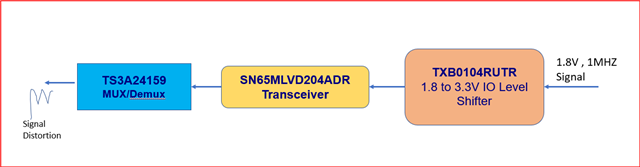 1MHZ signal being driven from level shifter to de-MUX section as mentioned below. I have observed the distorted signal at de-MUX output and also voltage level is clamped and distorted to 2.4V instead of 3.3V.