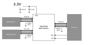in our application we need to connected two MIPI cameras of 2 lanes to our i.mx8 processor. At a time only one camera shall be accessed by the imx8.