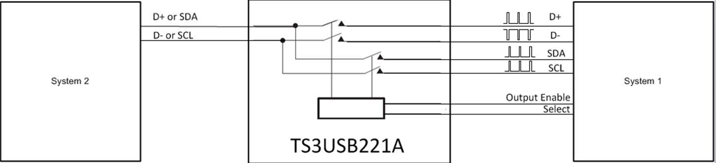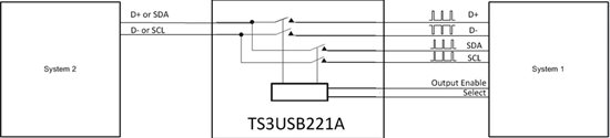 The TS3USB221 is a great fit for I2C and USB 2.0 multiplexing applications since it is a bi-directional dual-channel single-pull double-throw (SPDT) switch. This switch has two signal paths to handle both handle the differential requirement for USB 2.0 and the data and clock signals (SDA and SCL) required for I2C. You may pass single ended signals as required by the I2C standard as well as differential signals for USB 2.0 over the TS3USB221 without any performance implications. The TS3USB221 1.1GHz bandwidth will easily meet the 480 Mbps USB 2.0 requirements as well as the 3.4 Mbps High-speed mode and the uni-directional 5.0 Mbps Ultra Fast-mode I2C data rates.