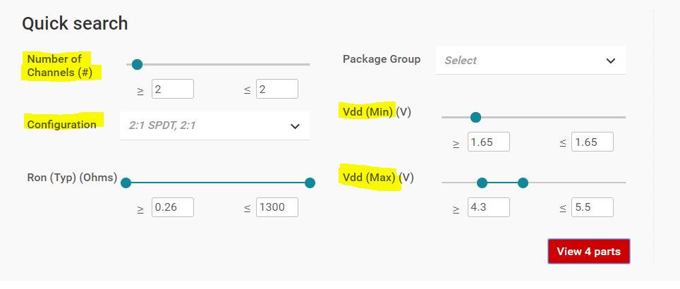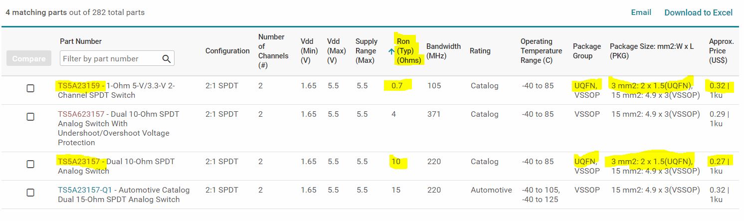 Then I sorted by lowest On-State Resistance (Ron) and as you can see below, there is a 2-channel, 2:1 switch in a UQFN package.