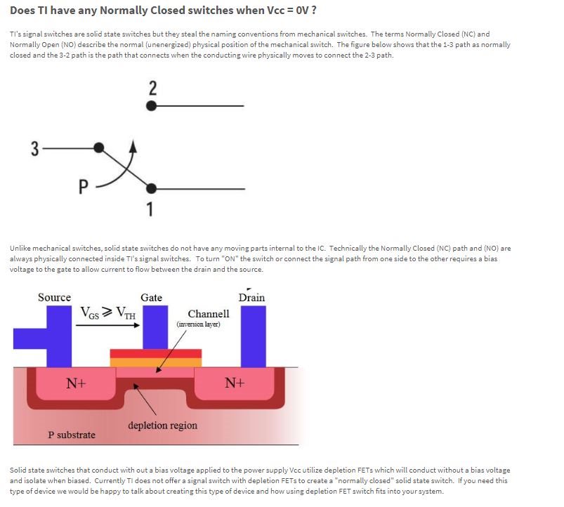 My customer need an analog switch in a BT earphone project, when battery is no power, auido sigal need pass COM to NC, so this requirment may need switch keep low resistance between COM and NC even when V+=0V. Is this possible for TS5A3159? If not, is there any other suggestion for this function? Thanks a lot. This fuction is required on many battery powered earphone, such as BT earphone, ANC headset, etc.