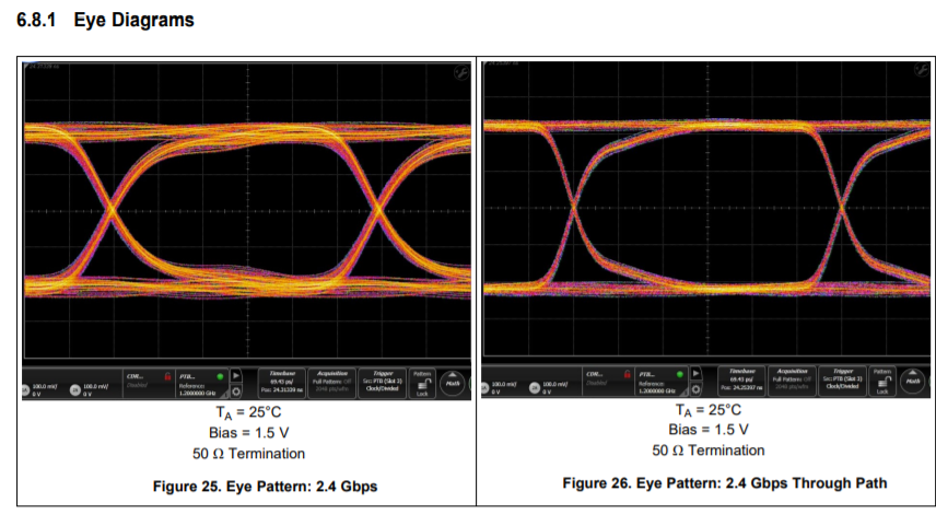 The datasheet includes an eye pattern at 2.4 Gbps at a Bias Voltage of 1.5V: