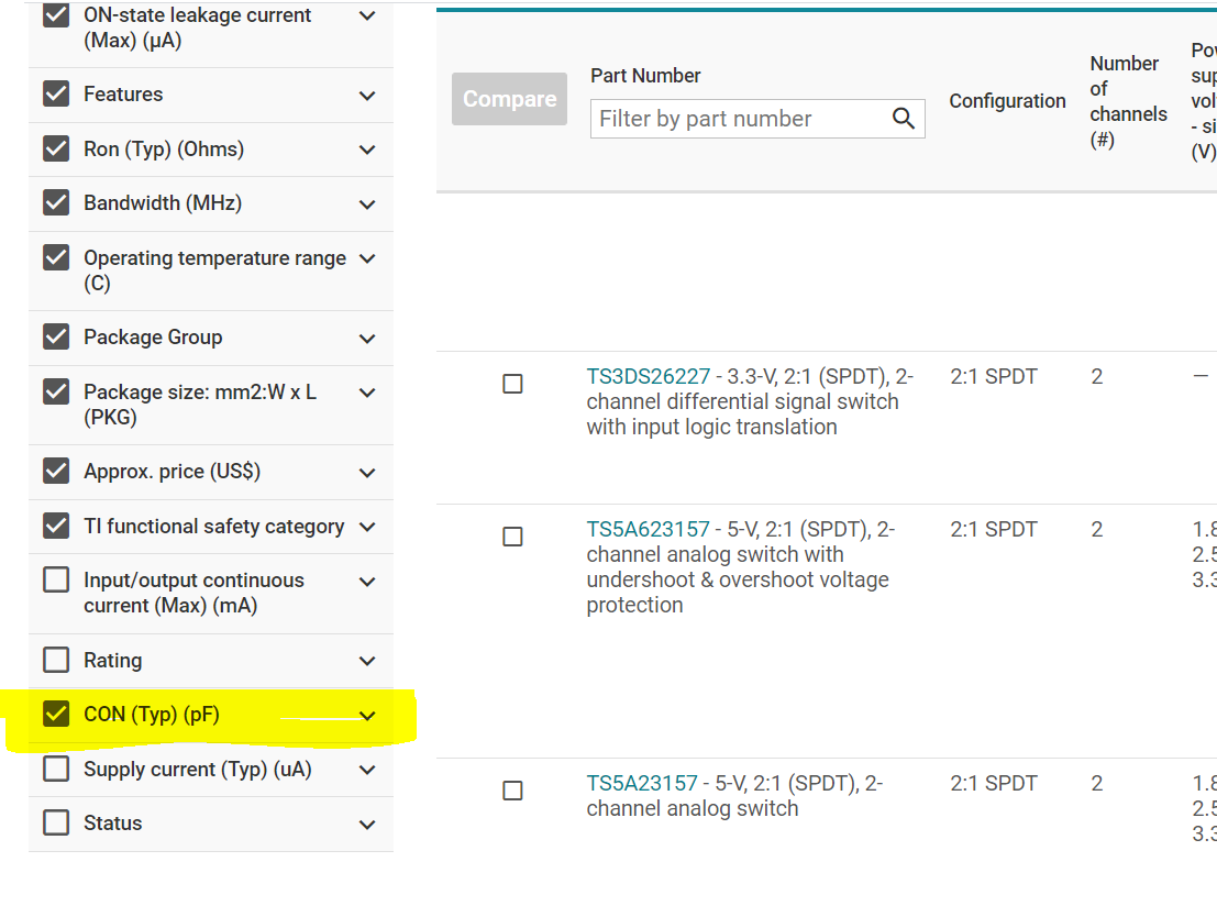 This will show the on-capacitance of the switch on the far right side of the spec columns: