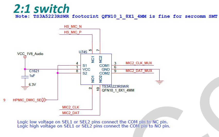 The digital MIC clock is output from CODEC MIC2_CLK_7218 into COM1 of TS3A5223.