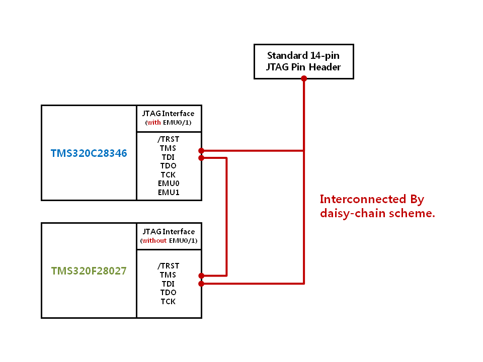 (JTAG interface is interconnected with daisy-chain scheme without EMU0/1.)