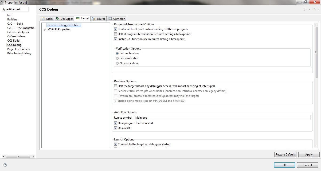 You can get the target to do the same as with a normal C project by replacing run to "main" with run to "Mainloop" ,,,, see the screenshot of the debug settings.