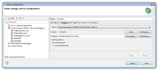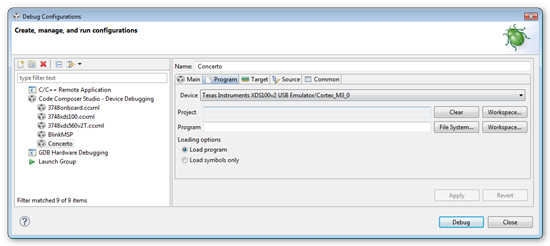 In Debug Configurations select your project on the left hand side (note that the project won't show up until you have launched once). Click on the program tab. Then you can pick the core (in the drop down) and select a program to load.