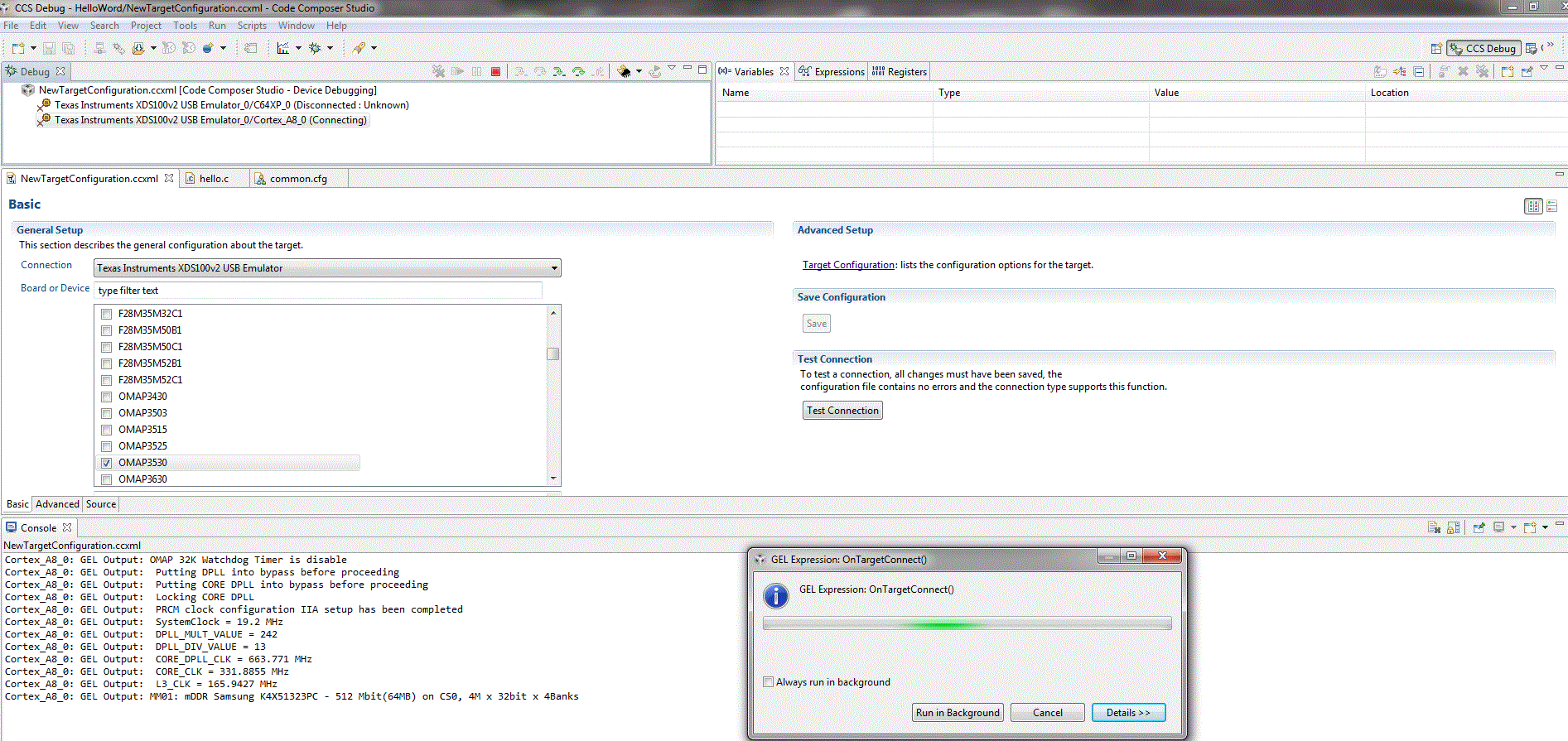 From CCS5, I did "Test Connection" and it appeared the scan results were ok. My problem is when I debug the "Hello World" program, CCS5 did not complete the launching of the program. I include the CCS5 log zip file.