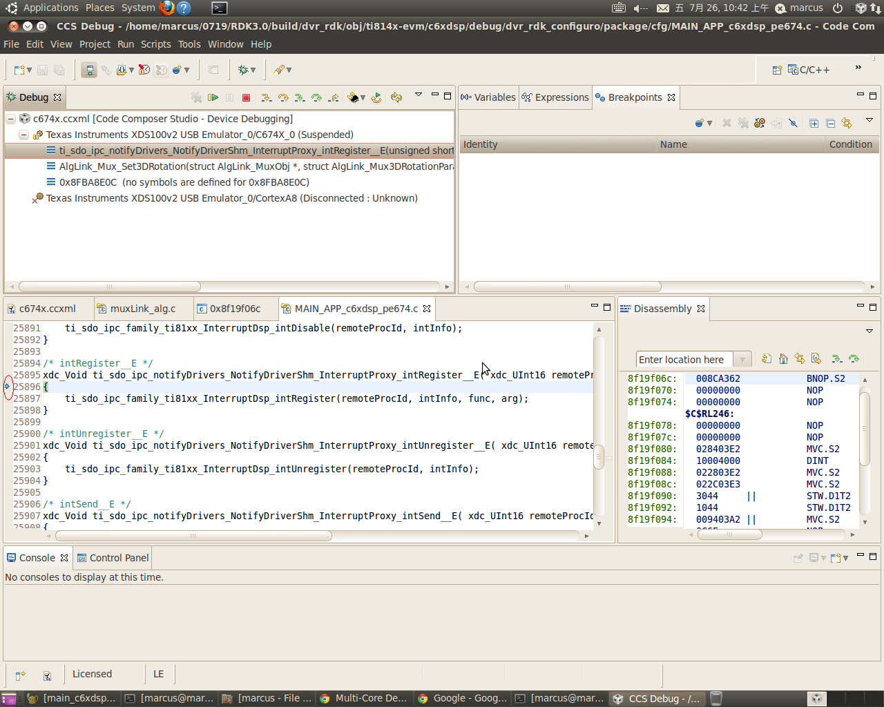 5.Chose Run->Load->Load Symbols and chose dvr_rdk_fw_c6xdsp.xe674. (I do not know if the file I chose is correct)
