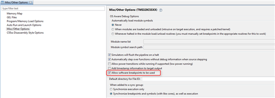 - The memory map screenshot you sent does not differentiate between RAM or ROM or Reserved memory regions, therefore I imagine you are not using a GEL file in your system (usually GEL files set the memory maps according to the device specifications). If so, could you try to use one and see if this helps gain some stability in breakpoint behavior?