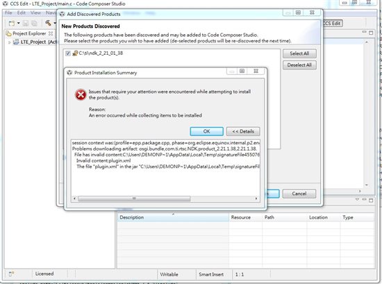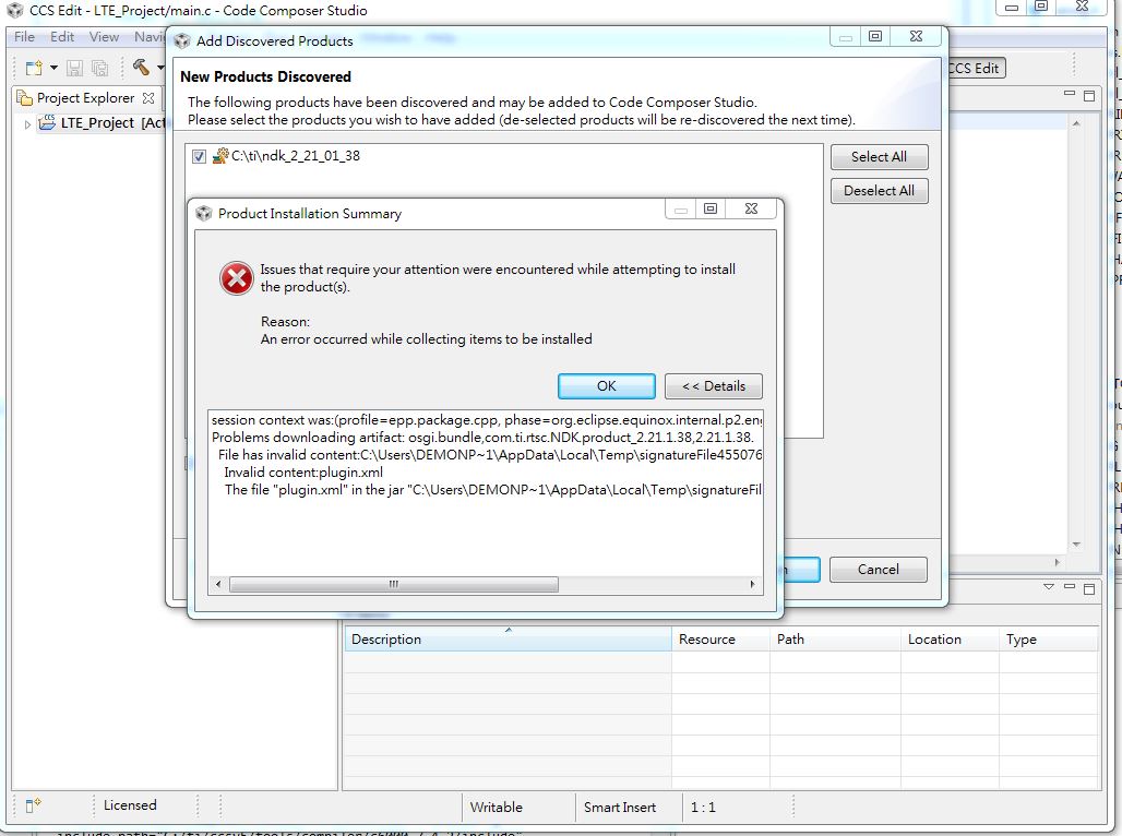 Problems downloading artifact: osgi.bundle,com.ti.rtsc.NDK.product_2.21.1.38,2.21.1.38.