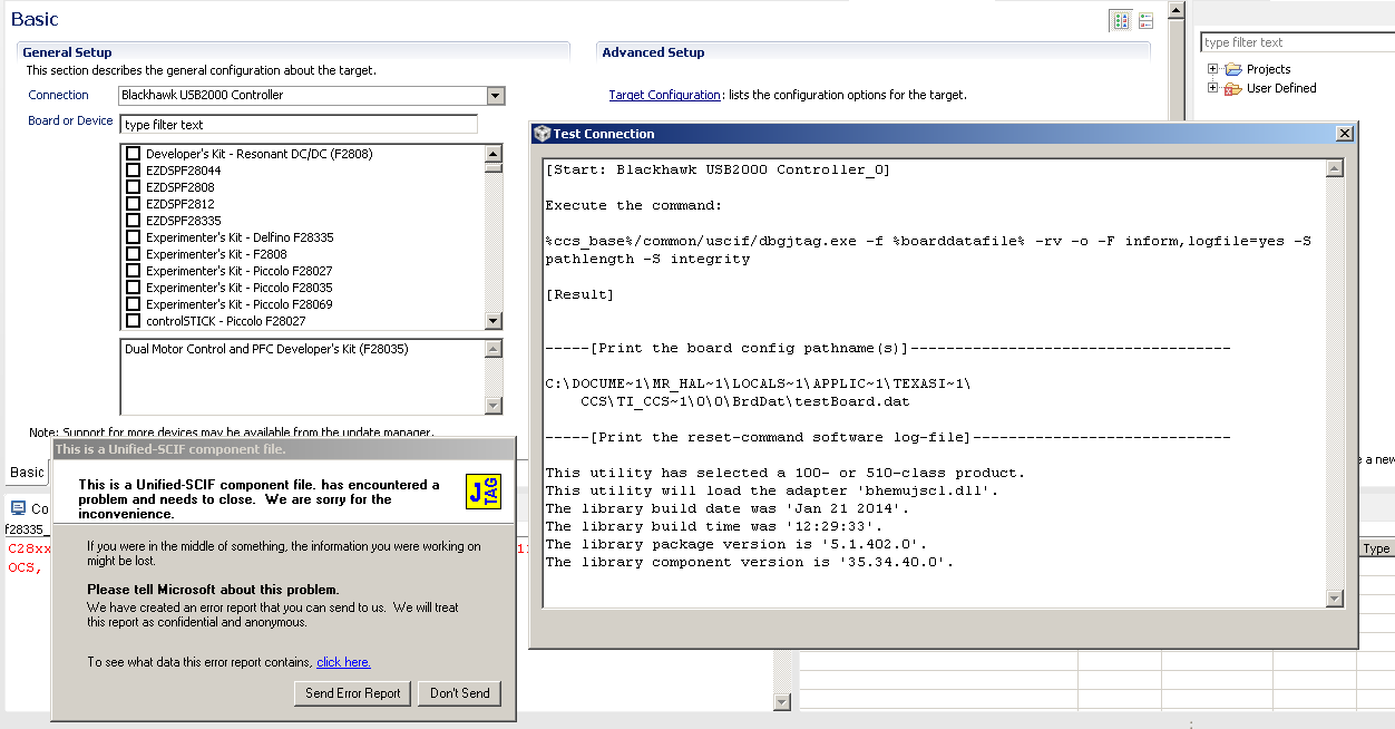 I am trying to debug multiple targets over two USB2000 JTAG emulators. I am running CCS5.5.0.00077 and the targets are one TMS320F28035, and the other is a TMS320F28335. What happens is that I manage to launch the debug session on one of my CCS instances. Immediately after I push the button to launch the second session in my other CCS instance, that instance of CCS crashes. There are no error messages whatsoever, the CCS window just disappears. The first time I tried this my workspace was even corrupted because it was locked by the crashed CCS instance.