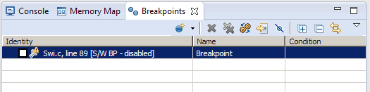 3. Open Swi.c in CCS (already opened from running previous scenario). Try putting breakpoint at main() by double clicking any line. The breakpoint is added but disabled: