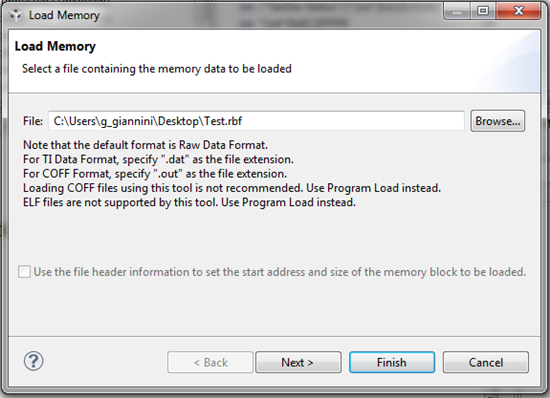 I've a c6678 DSP connected via Jtag and i want to use the Code composer feature for load the memory with an external binary file using Tool->Load Memory