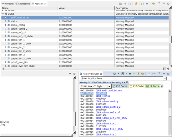 If in the register view right click on the emif_mod_id_rev register and select "View Memory At Address" the memory browser opens at the correct address and displays non-zero values: