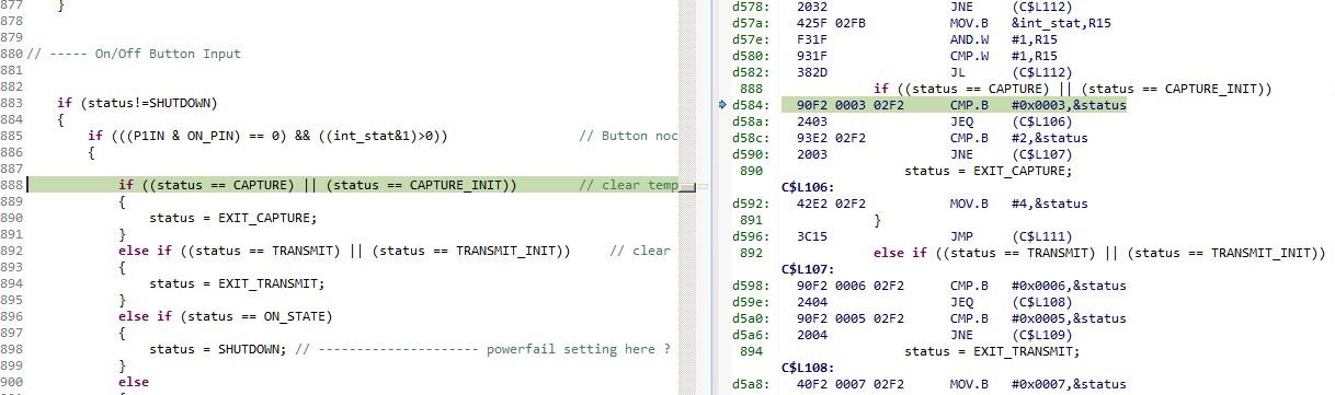 Already this setting creates difficulties with the generated code. See yourself, this is the code compiled with optimization turned finally OFF. On the left hand side you see the C code, right hand side the assembly code. The green highlighted instruction on line 888 is the one that will later be "optimized"