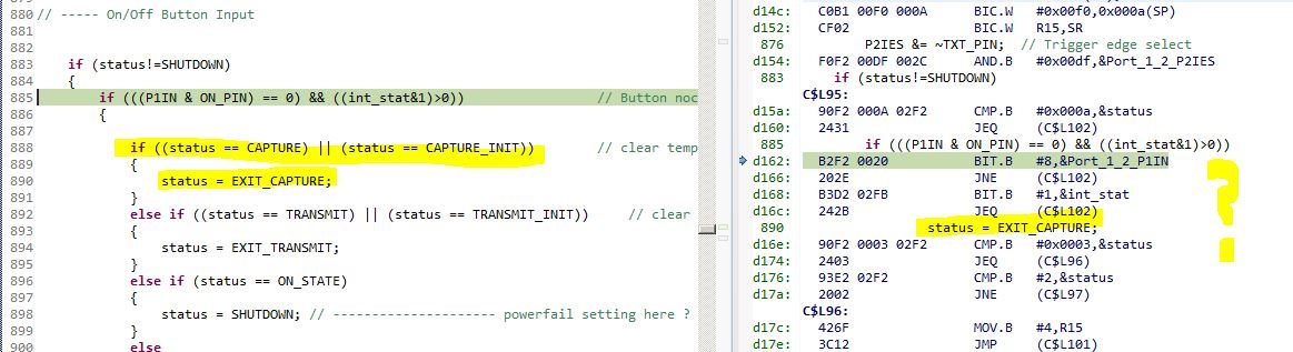 Now, taking an even closer look, the missing condition in the C code is line 888. Interestingly, the debugger can not even correlate an instruction on the assembly side to this line number. That means the system COULD detect that mistake in optimization and prevent the code from being corrupted!