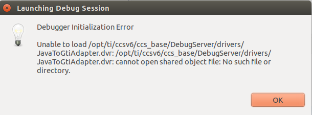 I'm using Code Composer Studio Version 6.0.1.00040 on Ubuntu 14.04. I'm an attempting to debug on an MSP430G2452. I am using a LaunchPad. When I click the debug icon, I get a popup :