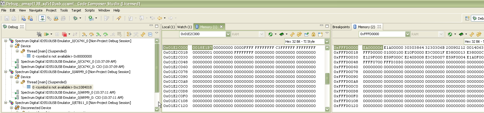 I have the OMAPL138 experimental board with xds510 emulator.I can successfully use the emulator to connect to the dsp and the arm side.After the connection,using the CCS3.3 function button "View Memory",and type the memory address,I could see the memory content correctly on the dsp side,but not on the arm side.On the arm side,I could only see 0x1 on each cell of the memory grid.