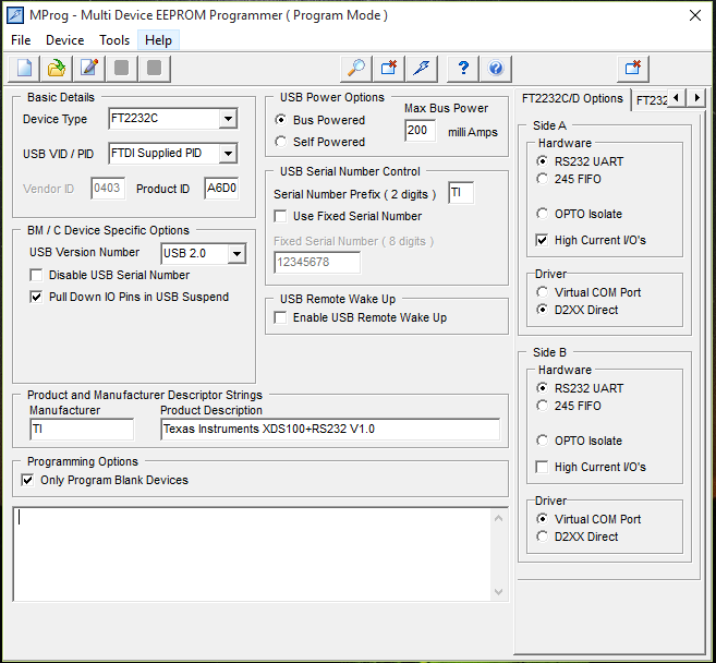 Current Problem: When following the steps to re-program the EEPROM on the XDS100v2, the re-program fails. This occurs after the initial open of the XDS100_wUART.ept file, the scan and the erase. If I read the device after the erase the device shows FF for all locations. When I try to re-program it fails and outputs an error message stating no devices found. Below are screenshots from the initial scan, the erase, the read to show FF and the failure to re-program.