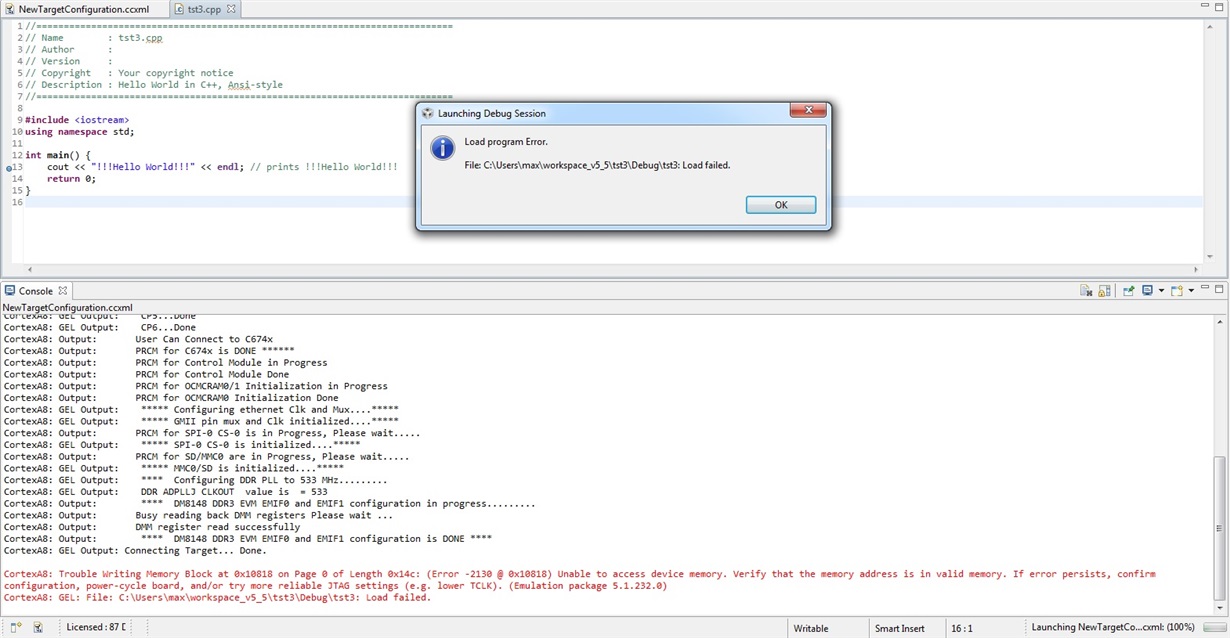 CortexA8: GEL: File: C:\Users\max\workspace_v5_5\tst3\Debug\tst3: Load failed.