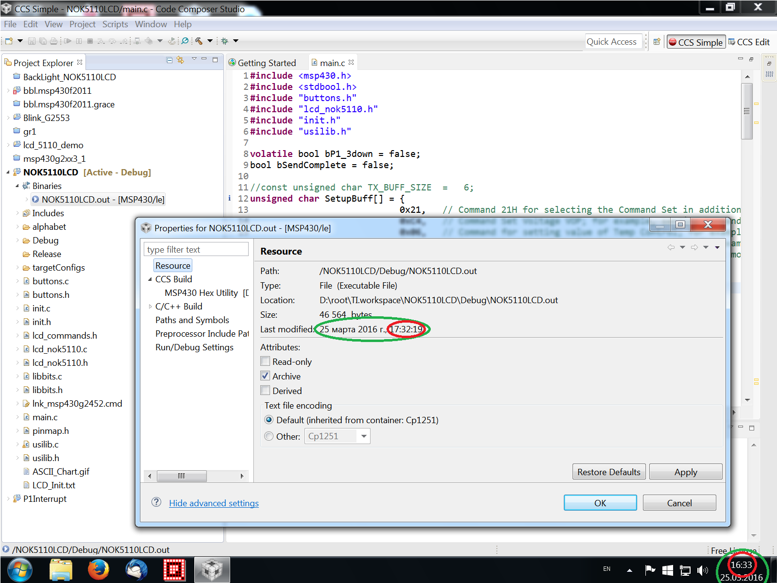 Immediately after build the project I open NOK5110LCD.out file properties window.
